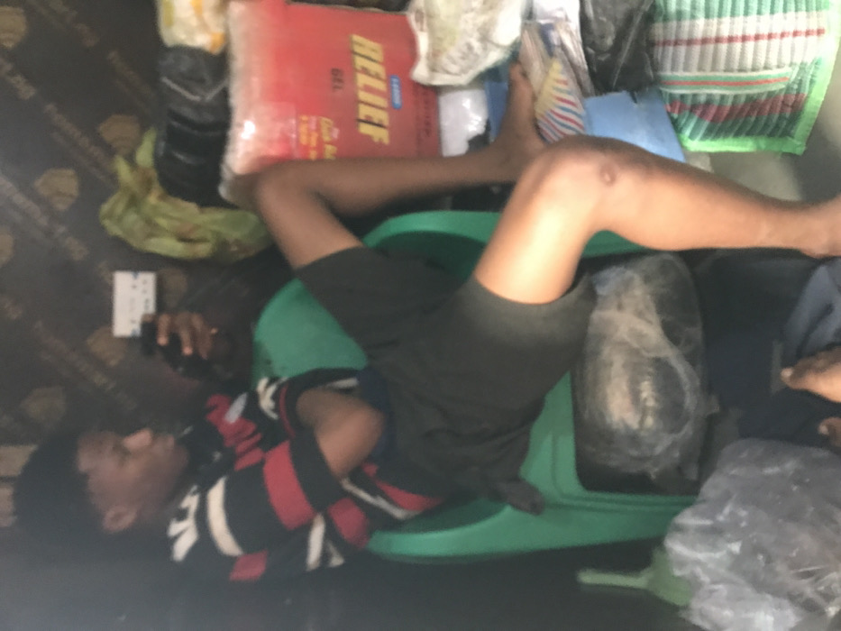 An indoor scene depicts a young male, dark-skinned with short dark hair, seated on a green plastic chair. He wears a horizontally striped long-sleeve shirt (red, white, black, and blue/grey) and dark shorts, and is barefoot. His gaze is directed downwards at a dark-colored smartphone held in both hands. His right foot rests on a stack of items to his right, revealing a small scar or mark on his right knee. His left foot is partially visible in the lower left foreground. The background wall is dark, possibly paneled, and features a white electrical outlet. The environment is cluttered; to the right of the subject is a large red container labeled "RELIEF" in white, surrounded by various plastic bags, bundles, and textiles. Items include clear plastic bags containing indistinguishable contents, and a green and white striped textile. A green plastic bag is also visible to the left of the chair. The scene is moderately lit. This activity is situated within the city of Lekki, Nigeria.