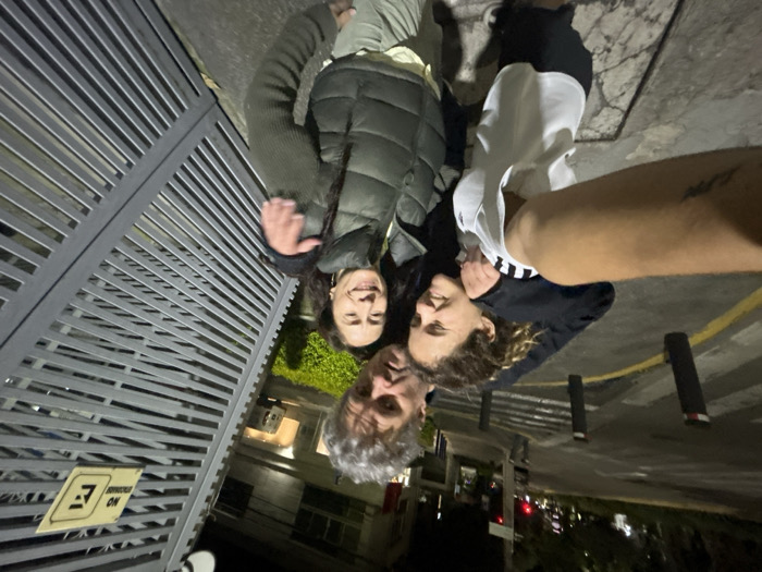 A nighttime selfie captures three individuals on a street in Mexico City, Mexico