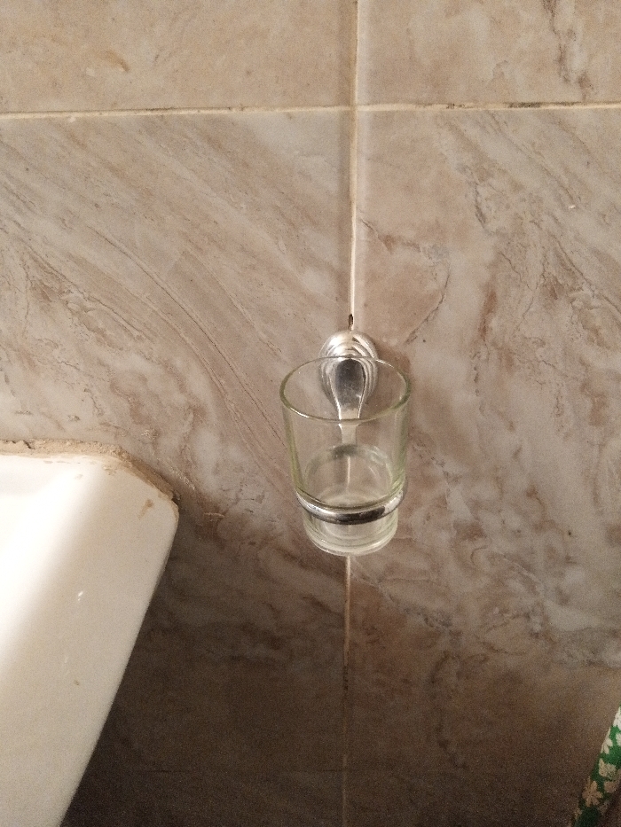 The image displays a close-up view of a bathroom or utility wall, featuring beige and light brown tiles with a swirled, marble-like pattern. Dark grout lines separate the tiles, exhibiting some discoloration. Centrally, a chrome or polished metal wall-mounted holder secures a clear, empty, cylindrical glass tumbler. The holder has a decorative, fluted design at its wall attachment point. In the lower-left corner, the top edge and side of a white ceramic fixture, consistent with a sink or toilet tank, are visible, showing signs of grime or yellowing. A small portion of a green object with a white floral or patterned design is partially visible in the lower-right corner. No people are present. The location is an unknown city, unknown region.