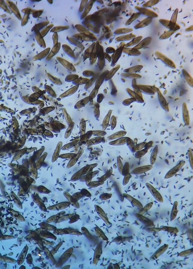 Under a microscope, numerous tiny, oblong, translucent organisms float in a light blue medium