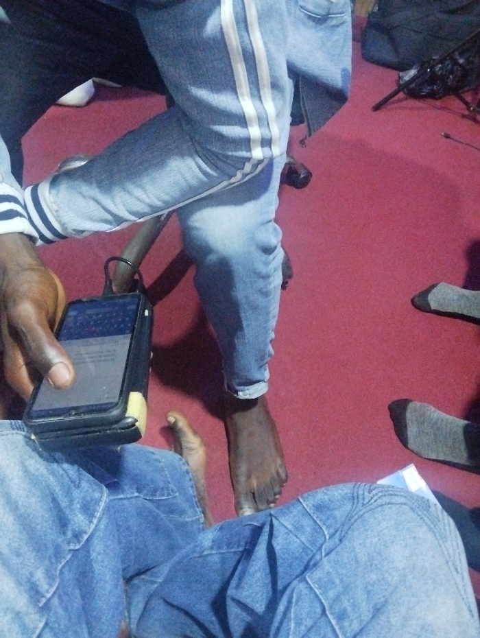 The image depicts an indoor scene in Maigizo, Nigeria, focusing on the lower extremities of multiple individuals on a red, carpeted floor