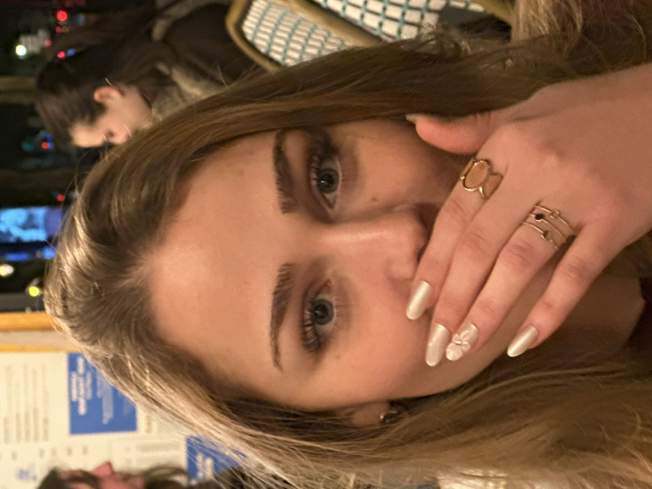 The image depicts a close-up portrait of a light-skinned female individual within an establishment in Paris, France. The primary subject is a young woman with long, light brown hair and blue-green eyes, looking directly into the camera. She wears prominent eyelashes and defined eyebrows. Her left hand is raised, covering her mouth and lower nose. Her fingernails are manicured with a light, pearlescent polish; the ring finger of her left hand displays a white decorative appliqué with a small central gem. She wears multiple rings on her left hand: two thin gold-toned bands with small dark heart details on the ring and middle fingers, and a wider gold-toned ring with an oval shape on her index finger. A small hoop earring is visible in her left ear. The background is out of focus. To the left, a partial profile of another individual with dark hair is visible, along with a light-colored sign displaying blue text. To the right, another person with dark hair, possibly tied back, is seated facing away from the camera. Adjacent to this individual, a classic Parisian cafe chair is discernible, featuring a light-colored frame and a woven pattern of light blue/green and white. The scene is illuminated by artificial warm light, suggesting an indoor or covered outdoor setting at night or in low light. The environment is consistent with a café or restaurant setting in the specified city.