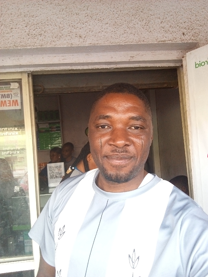 A man stands in front of a store, facing the camera. He has dark hair, a beard, and marks on his face. He is wearing a light grey shirt with white accents and a leaf design. Inside the store, there are several people, including children, and a sign with a QR code. The store's window displays advertisements.