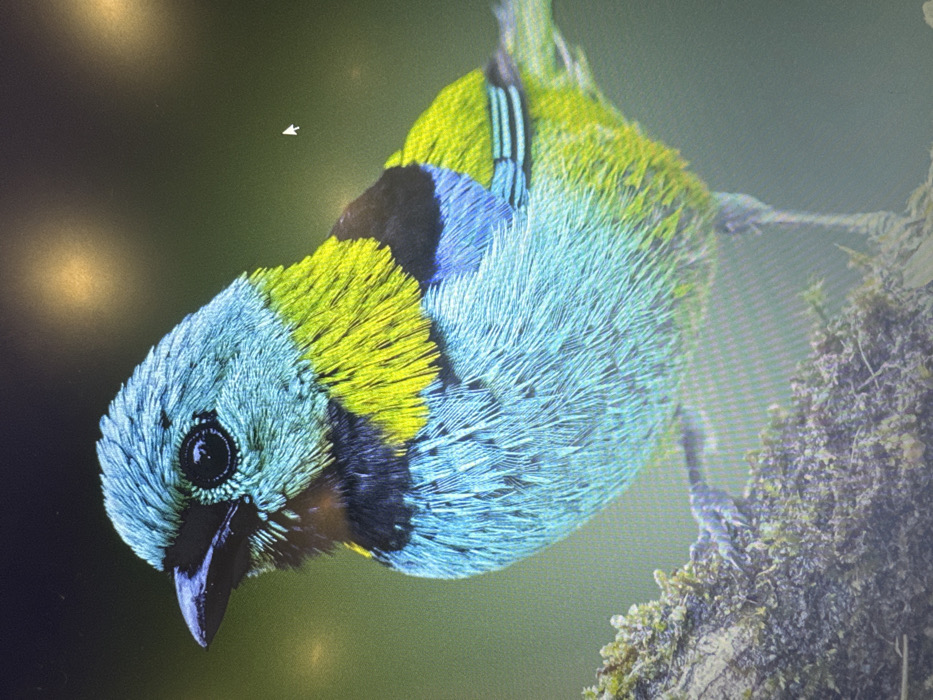 A close-up photograph of a multi-colored bird is displayed on a digital screen
