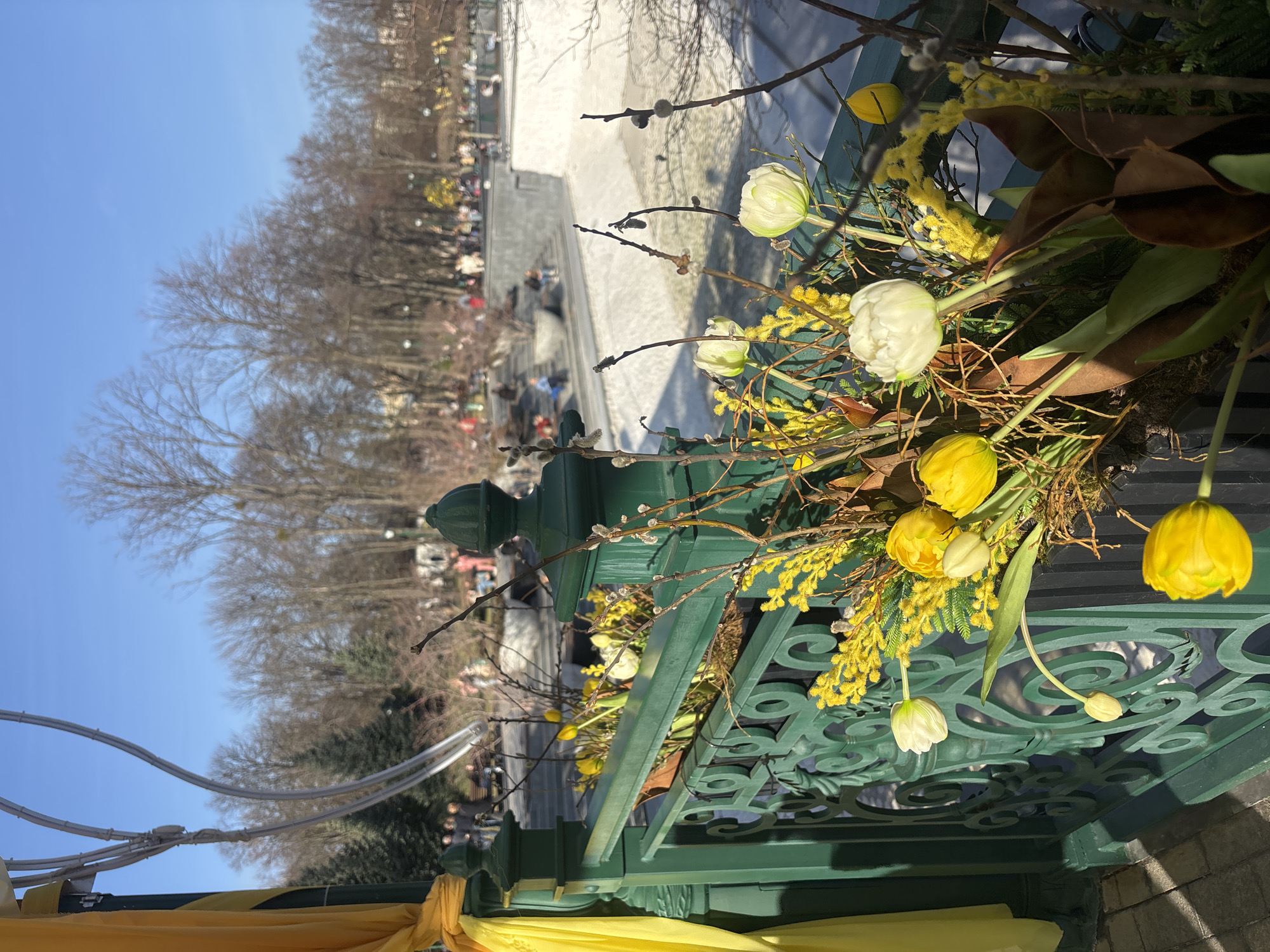 The photograph presents a view from an elevated vantage point, focusing on a green, ornate metal railing adorned with a floral arrangement featuring yellow and white tulips