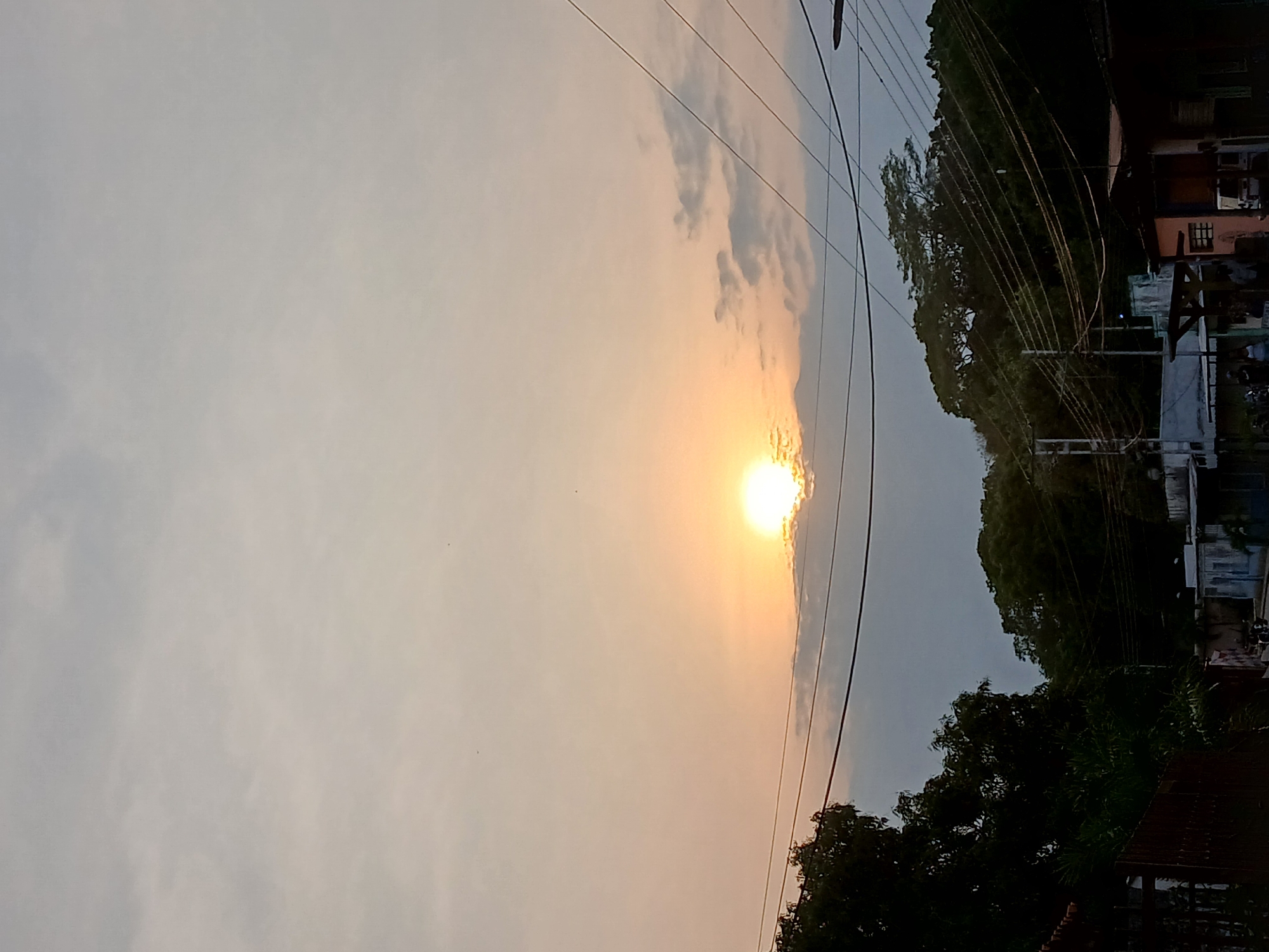 The image depicts a cityscape at sunset. The sun is positioned prominently in the center, casting a golden hue across the sky. Power lines crisscross the upper portion of the frame. Trees and buildings are visible on the right, providing a sense of context to the location.