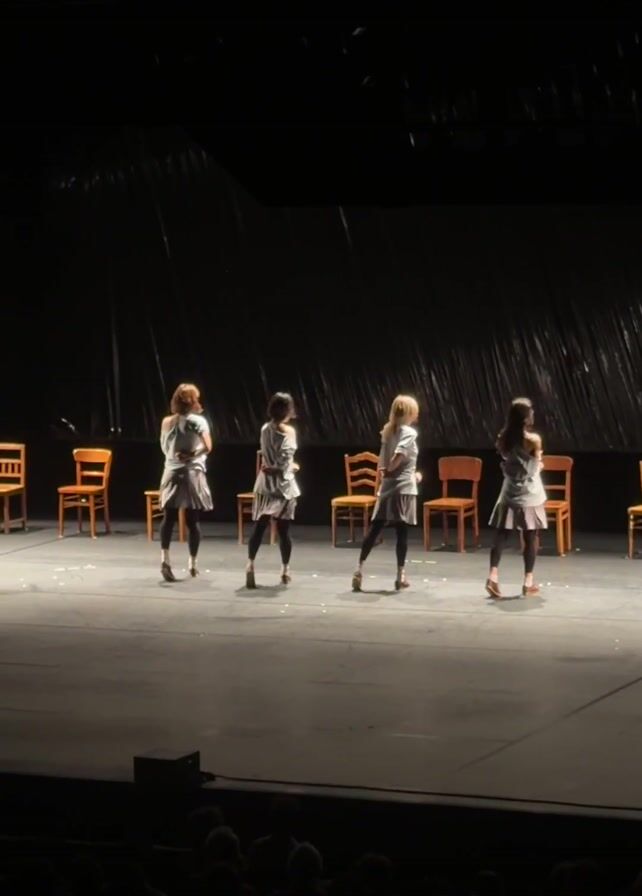 A dimly lit stage features four figures with their backs to the camera, shaking their heads, causing their hair to fly. They are all wearing similar outfits, including short, light-colored dresses. In the background, several wooden chairs are spaced out in two rows. The backdrop is black and slightly reflective, resembling a dark curtain. The blurred outline of an audience is visible in the foreground.