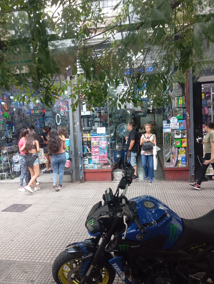 The image displays a street-level scene on a commercial thoroughfare in Buenos Aires, Argentina. In the immediate foreground, a blue Yamaha MT series motorcycle is parked on a light-colored concrete paver sidewalk, angled towards the right. The motorcycle features black and green Monster Energy decals and yellow wheel rims. Behind the motorcycle, approximately eight to ten individuals are present. On the left, a group of four young females in casual attire, including jeans, shorts, and a crop top, stand near the entrance of a retail store. This store's large glass windows display electronic goods, accessories, and illuminated signs, including a partially visible blue neon sign reading "TODO". Adjacent to this, in the center-right, an adult male and female are positioned at the entrance of another retail shop, which exhibits densely packed merchandise and a sign with "VISA" and "Maestro" logos. The female carries a white bag. A third male walks from right to left on the far right of the frame. Green leafy tree branches hang overhead, partially obscuring the upper sections of the shopfronts and creating reflections on the glass surfaces. The overall environment depicts a busy urban retail district.