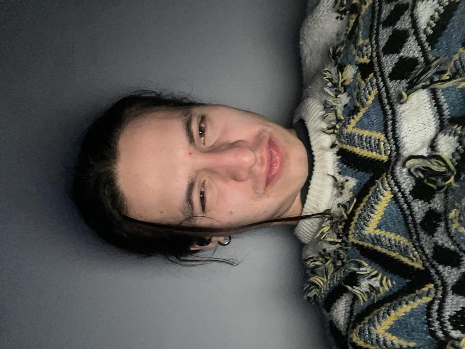 A person with long, dark hair pulled back is captured in a close-up shot. They wear a patterned sweater in shades of blue, white, and black with frayed edges. The background appears to be a solid, cool gray. The subject has fair skin, a slight smile, and a small blemish visible on their forehead. An earring is also discernible on one ear.