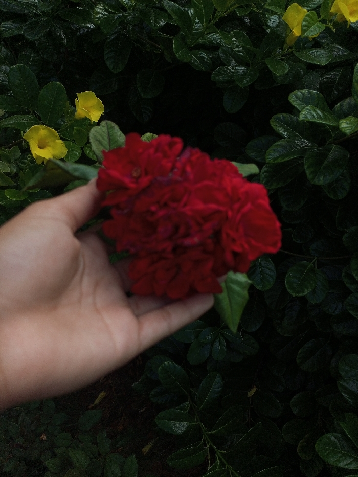 A close-up image depicts a cluster of deep red, multi-petaled flowers, possibly roses, held by an individual's left hand. The hand, with light skin tone, supports the flowers from beneath, displaying the palm and curled fingers. The background consists of dense, dark green foliage, appearing as leafy bushes or hedges. Scattered within this green foliage, particularly in the upper left and upper right portions of the frame, are several bright yellow, trumpet-shaped flowers. The scene is illuminated by natural light, casting subtle shadows within the foliage. The location is in the city of Pedro González, Venezuela.