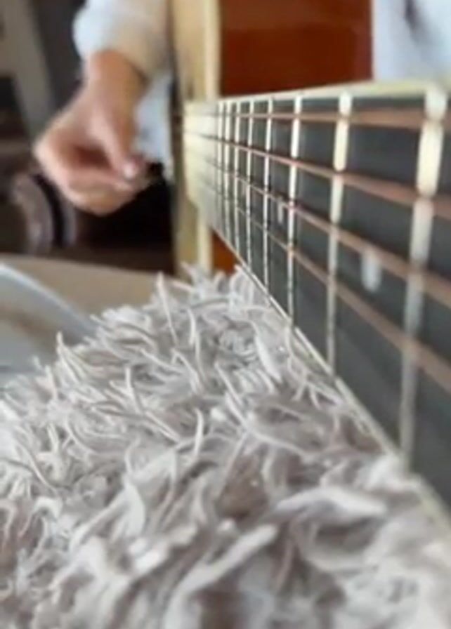 A person wearing a white long-sleeved shirt is strumming a brown acoustic guitar. The camera is positioned close to the guitar's neck, with a blurred background that includes a wooden chair and a glimpse of a window. The bottom of the guitar rests on a fluffy, light-colored rug or blanket. The focus is on the guitar strings and frets, with the person's hand and strumming action partially visible. The overall lighting is indoor and somewhat subdued.