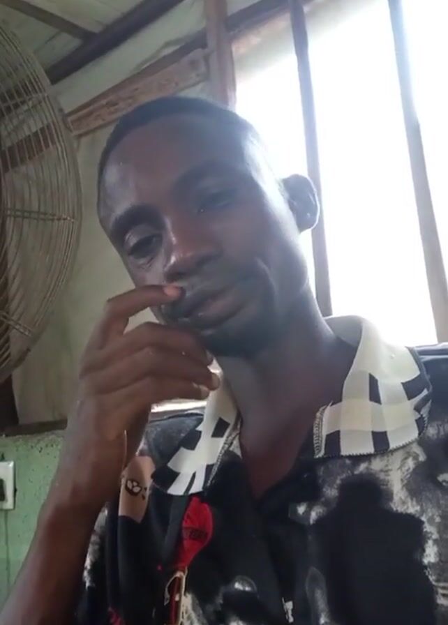 man from the chest up, looking directly at the camera. He has short, dark hair and a goatee. He is wearing a colorful patterned shirt. The background is a room with a window letting in bright light and a large fan is partially visible on the left side of the frame. The roof appears to be made of wooden beams. The man briefly touches his nose with his finger, then lowers his hand and looks at the camera. There is loud music in the background.