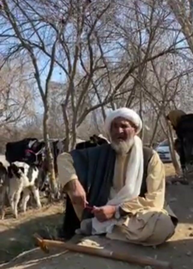 An older man is sitting outside in a dirt clearing under sparse trees. The man is light skinned and wearing a turban, a gray outer garment, and light colored clothing. He has a white beard and is holding a string of beads. A wooden staff is lying on the ground beside him. Behind him are a number of black and white calves, some behind a wire fence. A person in a dark garment and head covering is visible in the background. In the far background is a white car. The day is sunny.