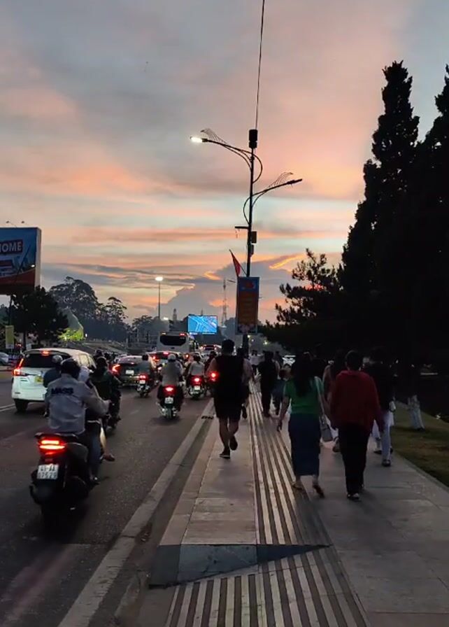 street scene at sunset. On the left, there is a road with cars and motorbikes. On the right, there is a sidewalk with people walking. A man is running down the sidewalk. There is a tall street light on the sidewalk. The sky is a mix of pink, orange, and gray. There is a billboard on the left side of the road. Trees are on the right side of the sidewalk.