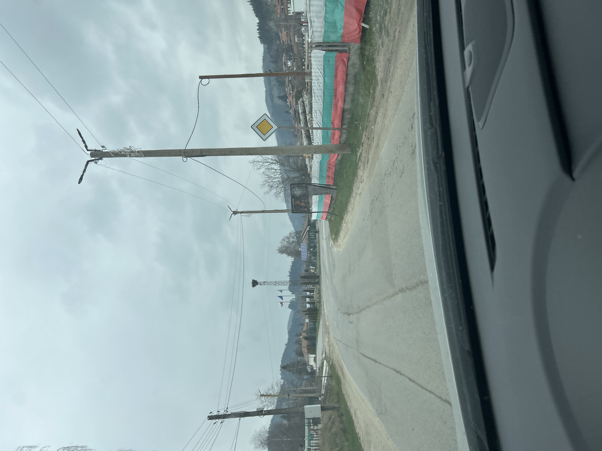 The image depicts a view from inside a vehicle, looking out onto a road in what appears to be a town or village setting. On the right side of the road are displayed multiple Bulgarian flags. Further down the road, on the left side, is a yellow diamond-shaped road sign mounted on a wooden pole. Power lines and utility poles run parallel to the road. In the background, a village is situated among trees and hills. The image is oriented vertically. This image was most likely captured in Koprivshtitsa, Bulgaria, as can be inferred by the multiple Bulgarian flags.