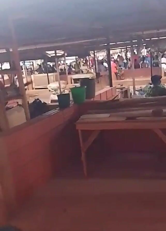 crowded market under a covered structure. There are people visible in the background, some sitting on raised platforms. In the foreground, there are wooden tables and steps, along with green buckets. The scene is busy and appears to be a typical market environment.