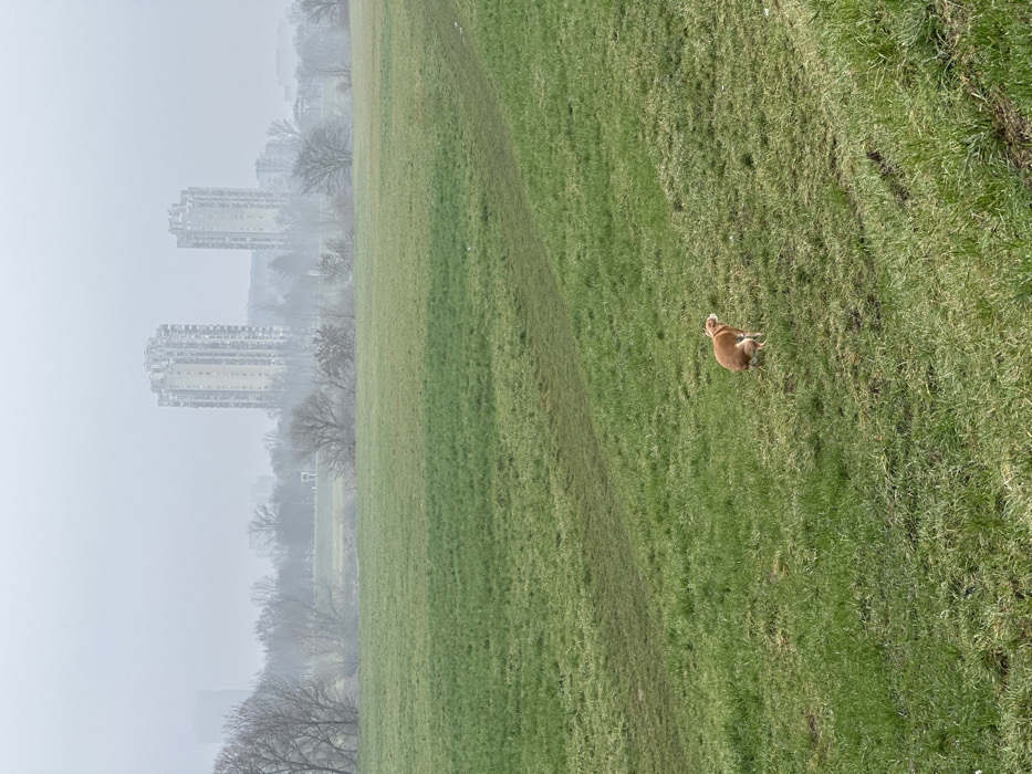 The image depicts an open, expansive green grassy field under a heavily overcast or foggy sky. In the mid-foreground, a reddish-brown domestic dog is observed in the act of defecating, positioned facing left and slightly upwards. The ground beneath the dog is covered in short green grass, with some worn paths or depressions visible in the undulating terrain. A line of bare deciduous trees and shrubs separates the immediate field from the distant urban landscape. In the far background, two prominent, identical, high-rise residential buildings with multiple balconies are visible through the haze, flanked by other indistinct structures. This scene is located in a green area of Novi Zagreb, City of Zagreb, Croatia, likely south of the Sava River, looking towards the distinctive "Rakete" residential towers in the Vrbani neighborhood. There are no people visible, and no interactions are occurring.