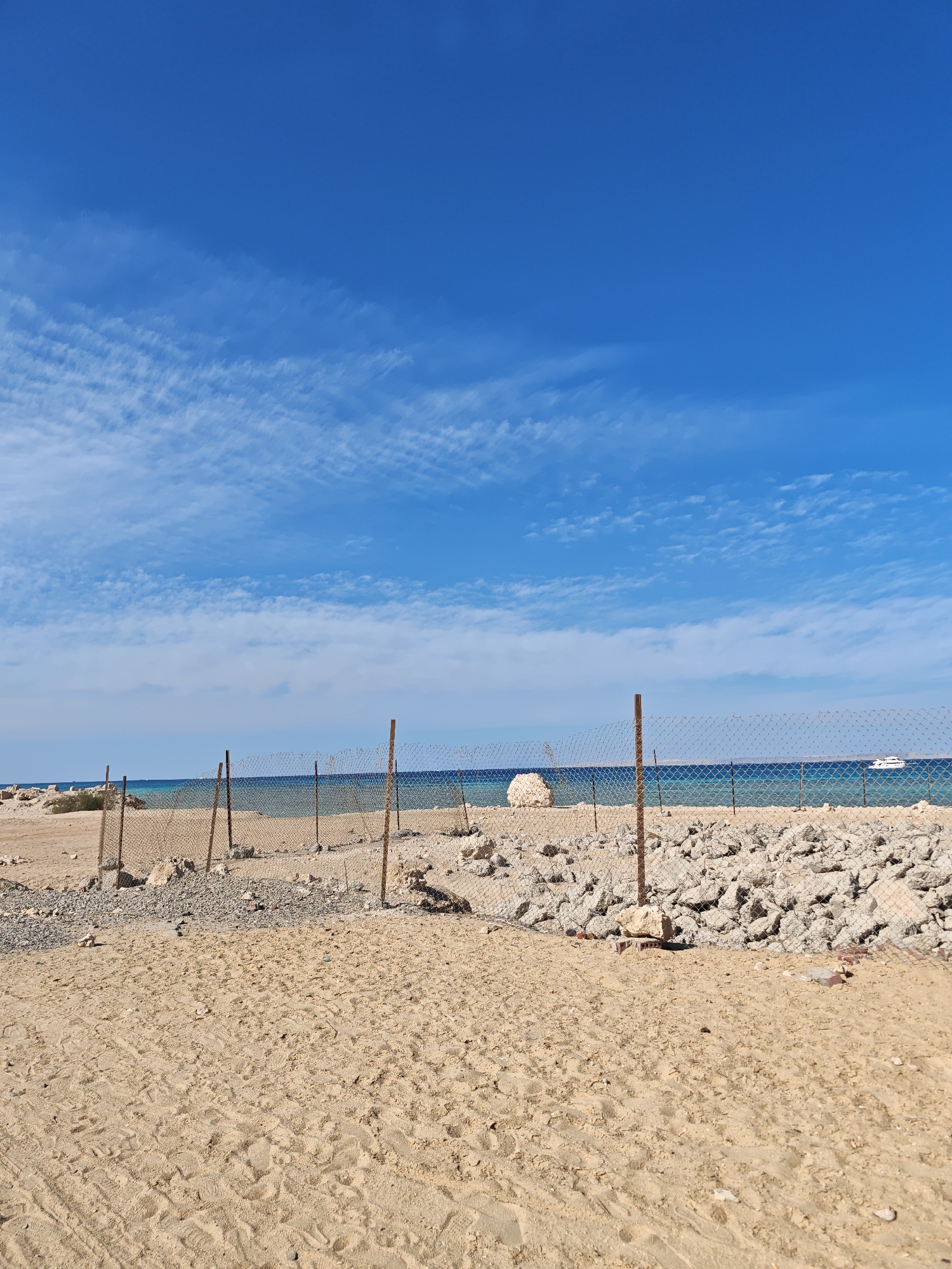 This image captures a coastal landscape in Al Ahia', Egypt, under a clear, vibrant blue sky featuring sparse, wispy white clouds concentrated in the lower sky quadrant. The foreground consists of an expansive area of light tan-colored sand, extensively marked with numerous footprints and minor depressions, indicating prior pedestrian activity. Approximately one-third of the way into the frame, a weathered chain-link fence, supported by at least seven rusty reddish-brown metal posts, spans horizontally across the scene. Immediately beyond this fence, a substantial accumulation of irregularly shaped, light-colored rocks and broken concrete debris forms a rough barrier or embankment leading towards the water. A small patch of low-lying green scrub vegetation is visible among these rocks on the left side of the frame. In the background, the sea displays a gradient of blue hues, transitioning from a lighter turquoise closer to the shore to a deeper blue further out. A white recreational vessel, characterized by a distinct cabin structure, is observed floating on the water in the far right portion of the sea. No individuals are present in the scene, and no active interactions or specific actions are depicted.