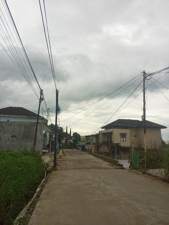 A narrow concrete road stretches between houses, lined with greenery on the left. Power lines crisscross overhead against a cloudy sky. Houses, some built on raised platforms, flank the road. A person walks in the distance where the road curves. Utility poles stand on either side of the road. The day is overcast.