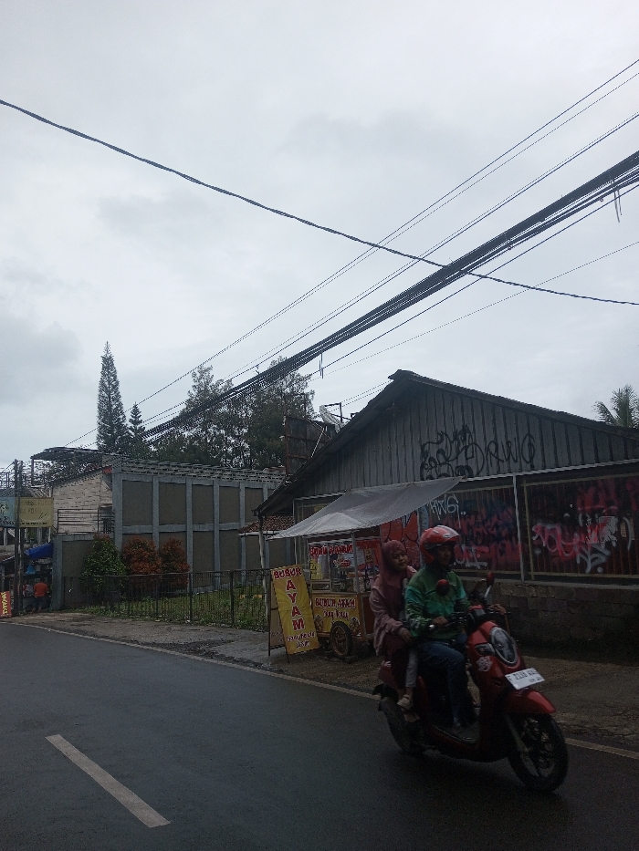 A street scene on a cloudy day shows a red scooter with two people, a food vendor's cart, and buildings. Graffiti adorns the wall behind the cart and a fence. Power lines crisscross the sky. The street is wet, and a white stripe is visible. The buildings appear to be residential, with varying designs and materials. Signage for "BUBUR AYAM" is visible on the vendor's cart.