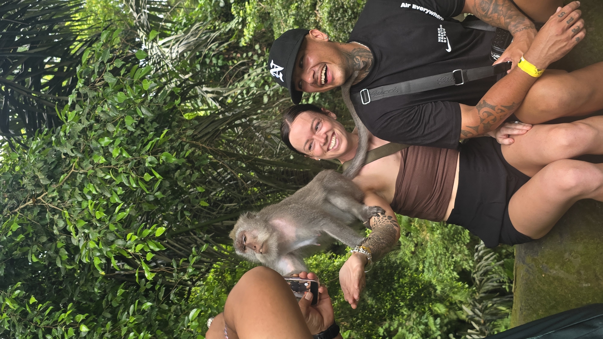 In the Ubud District, Indonesia, a couple poses with a monkey