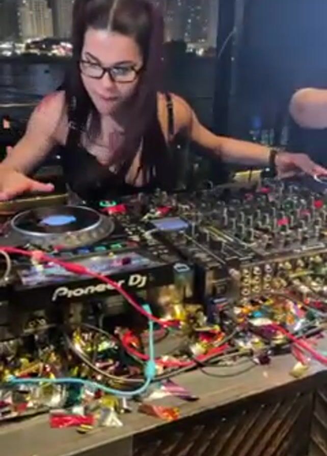 woman with dark hair in pigtails and glasses working as a DJ. She is wearing a black top, and stands behind a Pioneer DJ setup that is covered with confetti. She is manipulating the controls. To her right, a man in a t-shirt is dancing and smiling at the camera. Behind them, there is a cityscape visible through a window, suggesting the scene is set in a high-rise location. There are glasses and other items around the DJ setup.