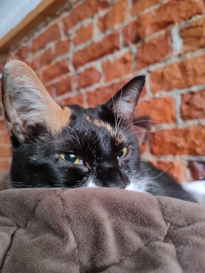 One domestic cat, a calico with black, orange/brown, and white fur, is depicted resting indoors. Its head is prominent, with predominantly black fur on its face, distinct orange-brown patches on its forehead and ears, and white fur on its chin and upper chest area. Its yellow-amber eyes are partially open, with black slit pupils, gazing slightly downward and forward. White whiskers are visible extending from its muzzle. The cat's chin and lower face are supported by a brown, textured, plush object, likely a cushion or pet bed, which occupies the lower third of the frame. In the out-of-focus background, a wall constructed of reddish-orange bricks with lighter mortar lines is visible. A light-colored wooden beam or trim runs horizontally along the upper edge of the brick wall. The location is Saint Petersburg, Russia.