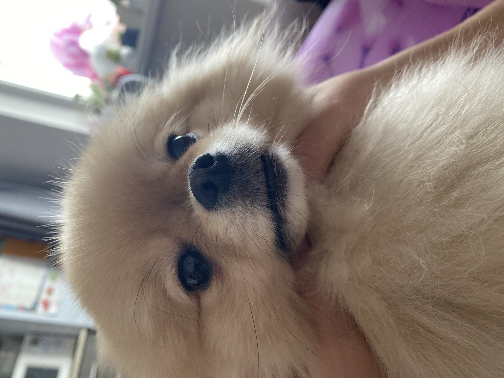 A close-up shot shows a light-beige Pomeranian dog lying on its side in an unknown city. Its face is the main subject, featuring a shiny black nose, dark eyes, and fluffy fur. Part of a person's hand is visible supporting the dog's head and neck. In the background, there is a glimpse of a room, including a window, a shelf with items, and a patterned blanket or fabric.