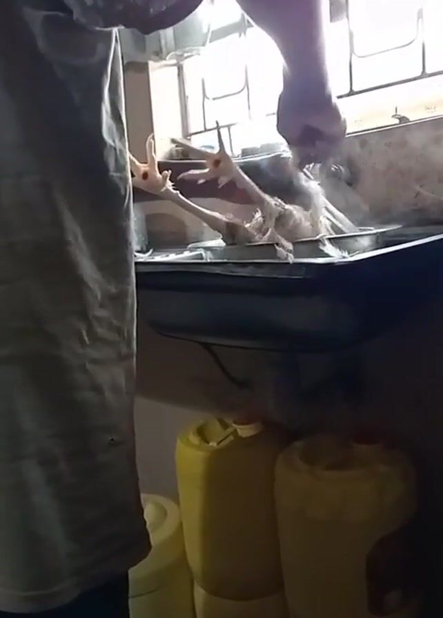 A person stands in front of a sink. In the sink is a silver tray containing two partially plucked chickens, releasing steam. The person is using their hands to pluck feathers from the chickens. Behind the person are several yellow containers. A window with bars is visible behind the sink.