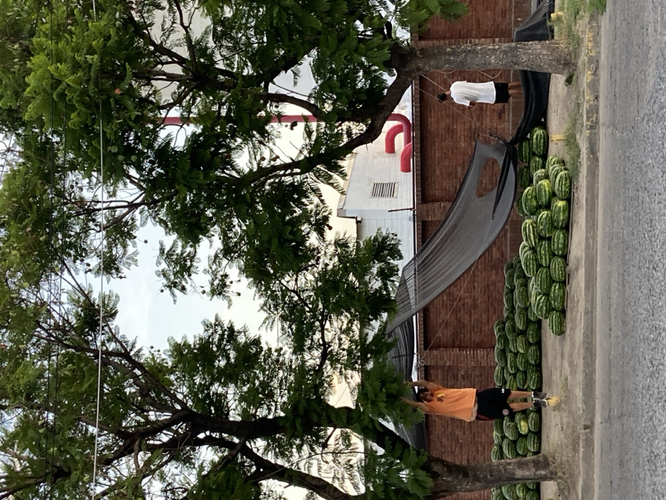 Two people stand beside a large stack of watermelons on a sidewalk next to a brick building with white architectural features. A dark mesh canopy stretches over the watermelons, providing shade. Trees frame the scene, their branches reaching towards the sky. The angle is slightly tilted, presenting a unique perspective of the scene. The day appears bright, with some visible clouds through the treetops.