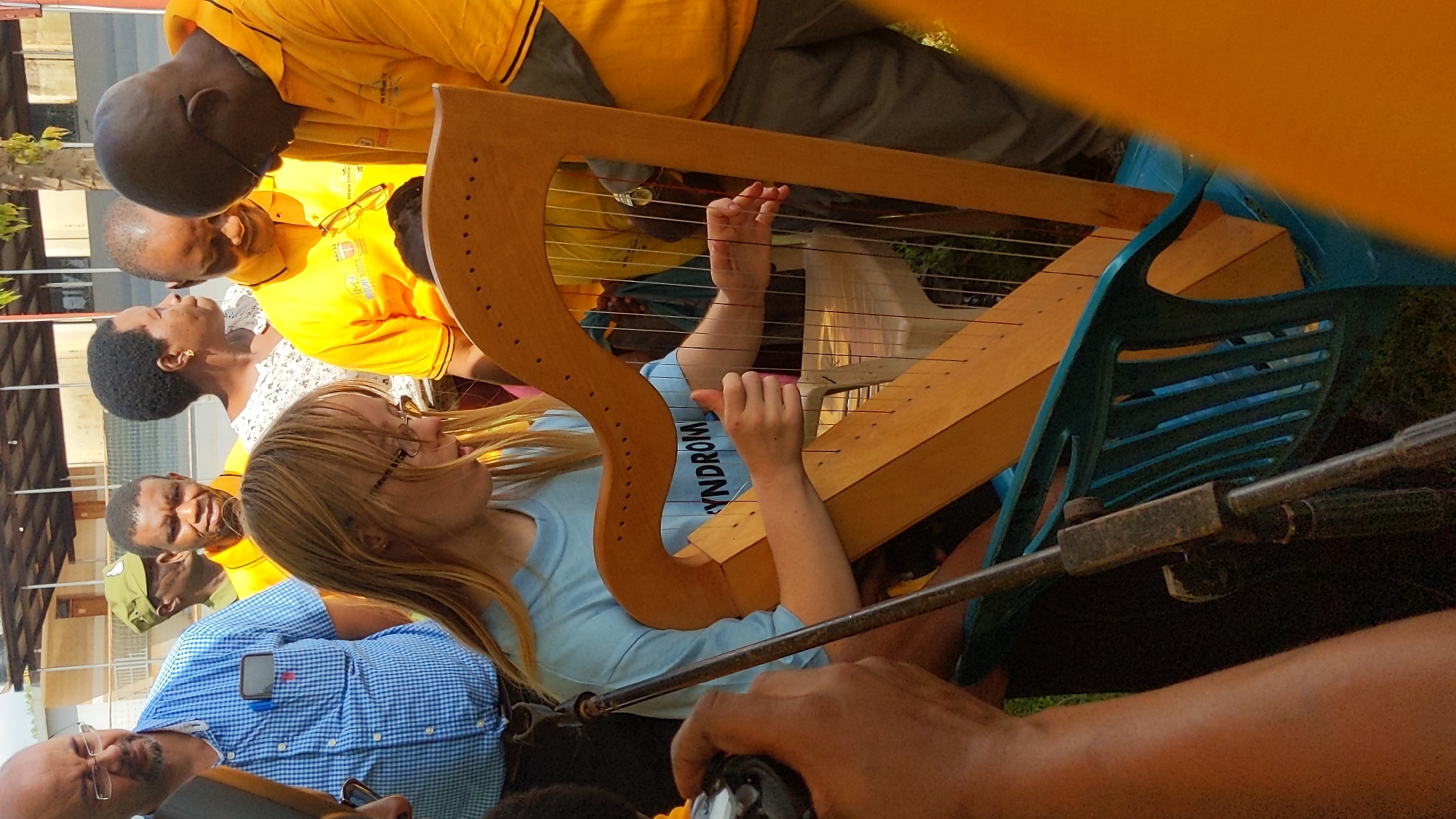 A young light-skinned female with long blonde hair and eyeglasses is seated outdoors, actively playing a light-wood lever harp in Moshi, Tanzania. She wears a light blue t-shirt with the partial word "SYNDROM" visible on the chest. Her hands are positioned over the harp strings, indicating active play. She is seated on a teal plastic slatted chair. Surrounding the player are several individuals observing. To the player's left, a light-skinned man with a beard and eyeglasses stands, wearing a blue and white checkered shirt with a smartphone clipped to his pocket. Behind him, a dark-skinned man in a green military-style cap is partially visible. Further back, another dark-skinned man in a yellow polo shirt looks towards the player. To the player's right, a dark-skinned man in a yellow polo shirt with "MOI" and "DOWN SYNDROM" logos holds eyeglasses and looks down at the harp. Another dark-skinned man in a yellow polo shirt, also with a "DOWN SYNDROM" logo, stands to his right, similarly observing. A dark-skinned woman with short dark hair is partially visible in the mid-background. In the extreme lower left foreground, a dark-skinned arm and hand hold a black object, possibly a camera or recording device. A dark metal microphone stand is positioned to the left of the harp. The background features light-colored buildings with dark roofs and some distant trees, under bright daylight conditions.