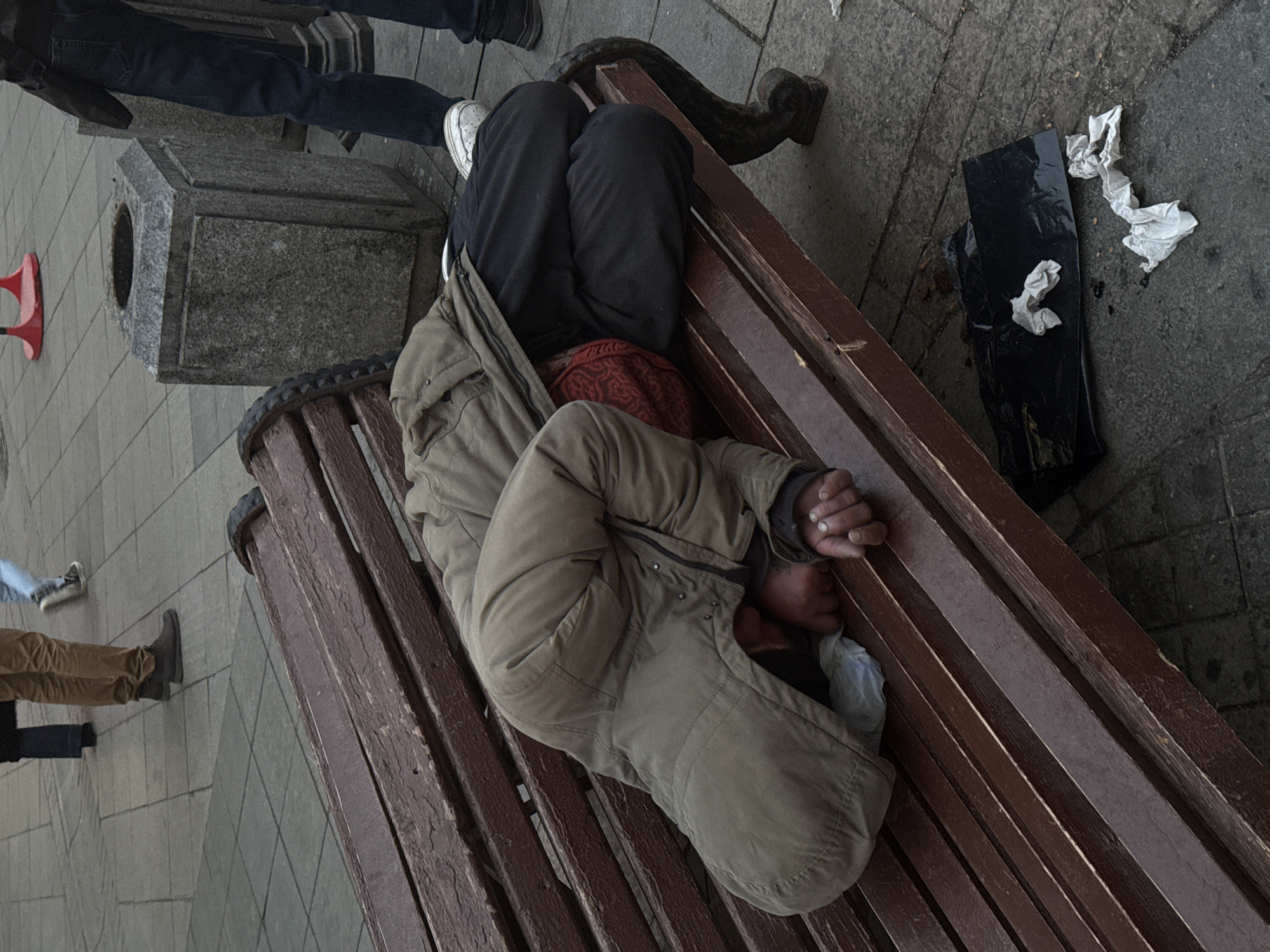 An individual lies curled on their left side on a dark brown wooden park bench in an urban pedestrian area of Moscow, Russia. The person is dressed in a drab olive-green hooded jacket, black trousers, and a visible reddish-patterned garment underneath the jacket. Their hands, appearing soiled and worn, are exposed, with a ring on the left ring finger. A crumpled white tissue is positioned near their right arm. The bench features worn wooden slats and dark, ornate metal supports. On the light grey tiled pavement directly beneath the bench, a black plastic sheet and several crumpled white tissues are scattered. To the right of the bench stands a grey, rectangular stone trash receptacle with a circular opening. In the background, the lower legs and feet of multiple pedestrians are visible traversing the tiled surface, including individuals wearing brown trousers and dark shoes, and dark blue jeans with white sneakers. A partial red object is discernible further in the background.