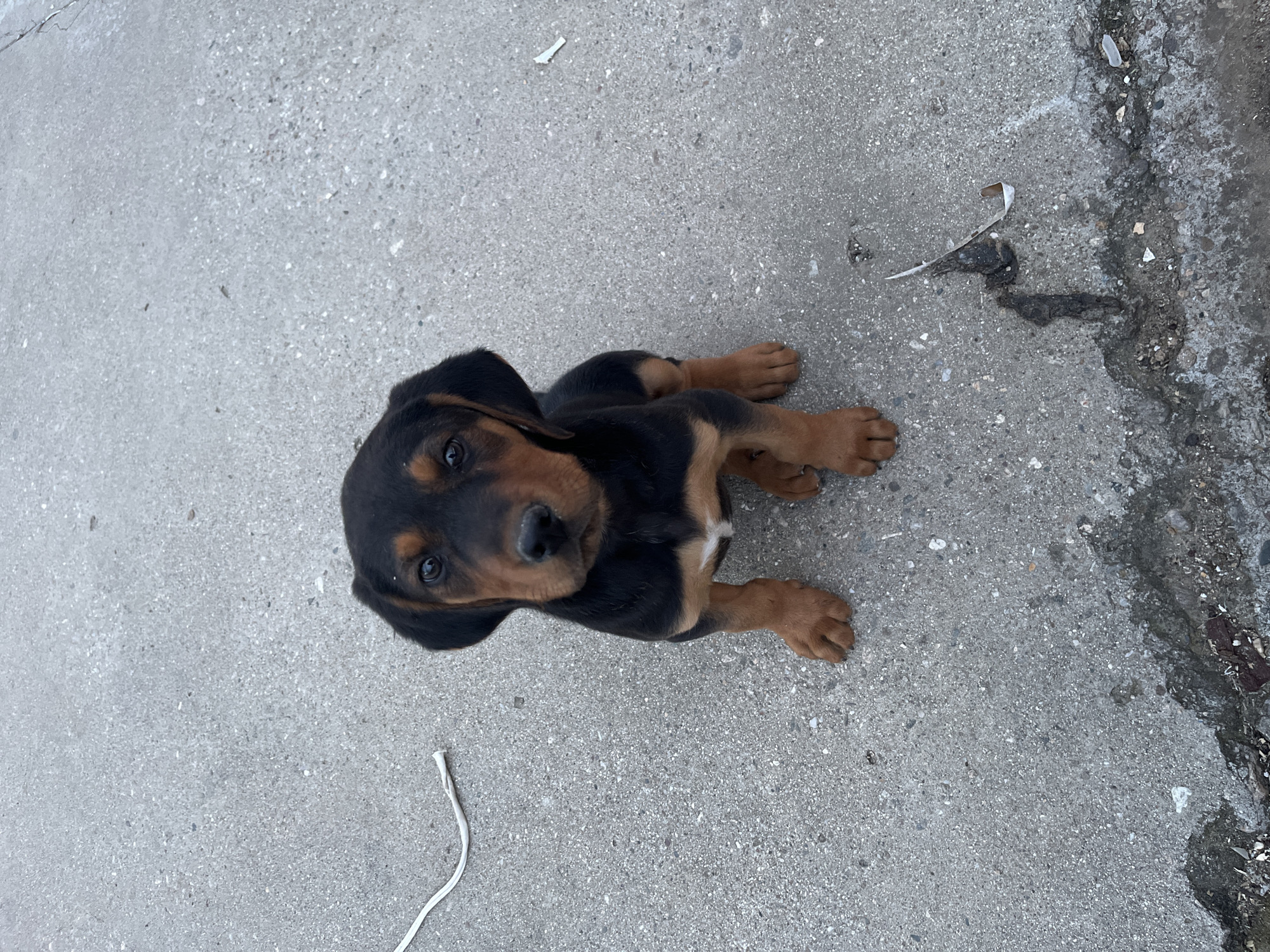A black and brown puppy sits on a gray concrete surface. The puppy faces upwards towards the camera. The concrete surface transitions to a darker, uneven texture near the upper right corner of the image. A thin white string lies on the concrete to the left of the puppy. There is a crumpled piece of paper to the right of the puppy. The location is Kulata, Bulgaria.