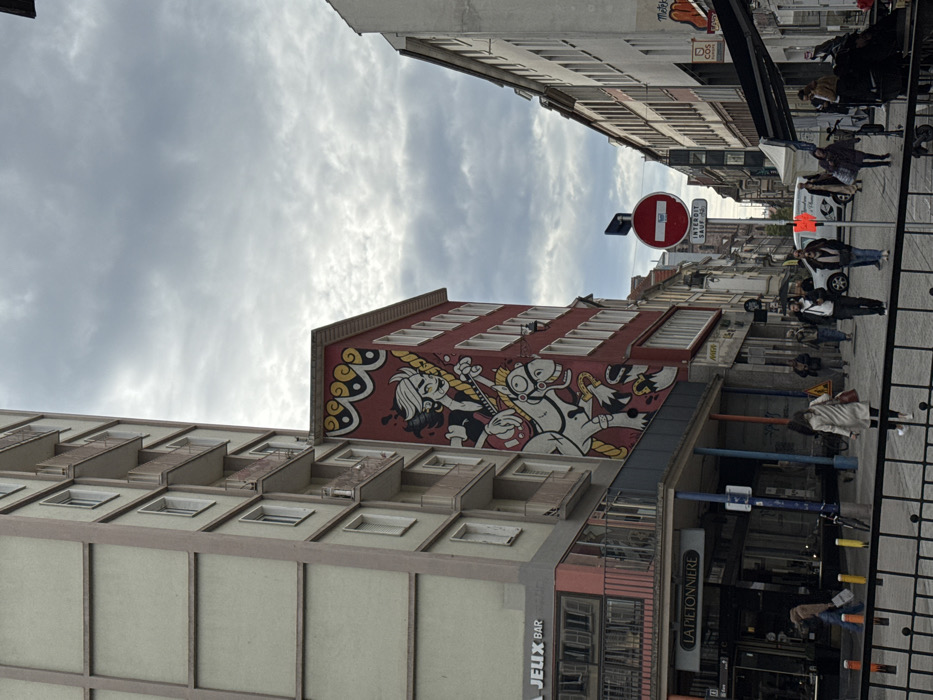 The image depicts an urban street scene on Rue du Vieux-Marché-aux-Vins in Strasbourg, France, under an overcast sky. On the left, a tall, multi-story building with a light beige exterior and several balconies features "A JEUX BAR" and "LA PIÉTONNIÈRE" establishments at its ground level. Adjacent to it, a five-story building with a red facade is adorned with a large mural. The mural portrays a stylized individual with dark hair playing a guitar while riding a white horse with yellow detailing; the background of the mural is red with yellow and white wave-like patterns at its top. To the right, a street extends into the background, lined with multi-story, light-colored buildings. In the mid-ground, a red circular "No Entry" sign ("Sens Interdit") with "INTERDIT SAUF" is displayed on a pole. The street level is populated by numerous pedestrians, walking in various directions. A person in a light-colored trench coat walks towards the right. Several individuals are visible near an outdoor seating area with an awning on the far right, where a black stroller is also present. Other objects include orange bollards near the left building and a bicycle parked by a blue pole. The scene indicates moderate pedestrian traffic in a European city setting during daylight hours.