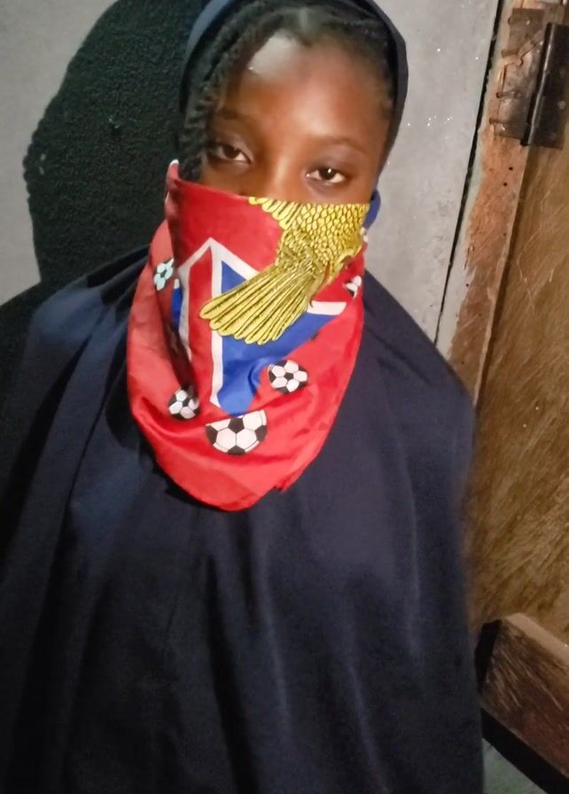 A person is wearing a navy blue hooded garment and a red, white, blue, and yellow patterned bandana over their mouth and nose. They are looking directly at the camera. The bandana appears to have a stylized bird and soccer ball designs. The person has dark skin and braided hair. They are standing on a gray surface, possibly concrete. A wooden structure with a metal latch is visible in the background. The lighting is dim.