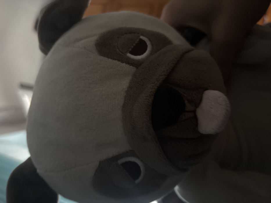 - "The image displays a close-up, front-facing view of a beige and dark brown pug dog plush toy, held by a human hand, situated indoors in Vidin, Bulgaria" by FM-bxjYb2, licensed under CC BY 4.0