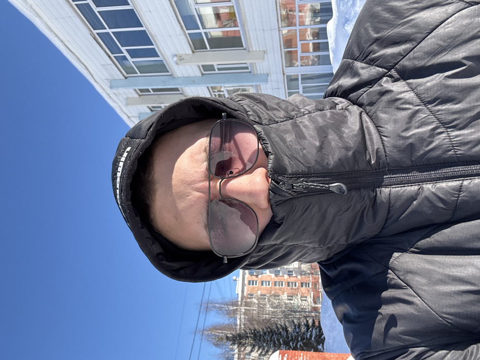 An individual is depicted outdoors on a clear, sunny winter day in the city of Chaikovsky, Russia