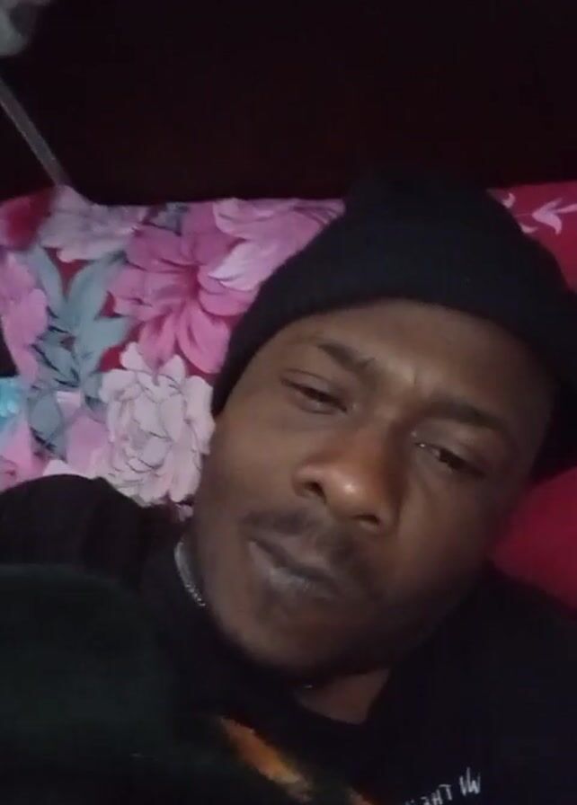 A person with dark skin and a black beanie hat is lying down. They have a goatee and are wearing a black t-shirt with white writing on it. They are resting their chin on their right hand and looking slightly down. The person is on a red surface, possibly a bed or couch, with a pillow that has a floral pattern. The background is dark, but a headboard can be partially seen.