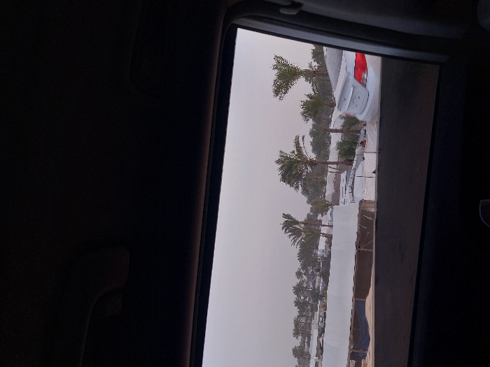 view from inside a vehicle. Palm trees are visible outside the window, swaying in the wind against a hazy sky. There are white structures, possibly tents or canopies, and a glimpse of a white car with red taillights. The lighting suggests it might be early morning or late afternoon. The overall scene evokes a sense of a beachside or waterfront location.