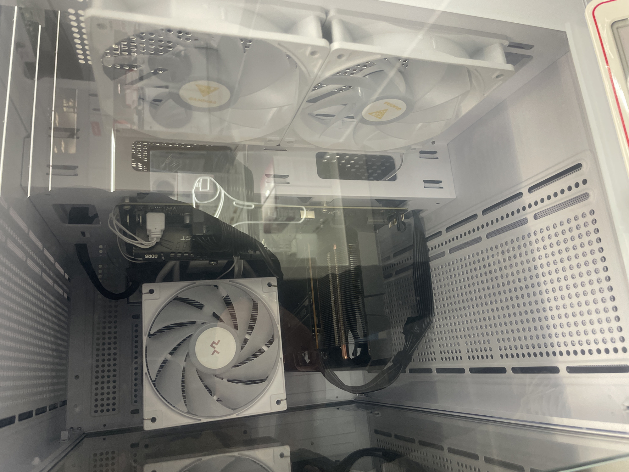 This image shows the interior of a computer case. The case is white and contains various computer components. At the top, there are two fans with a logo on their centers. Below those is what appears to be another cooling unit. Towards the center of the image, there is a motherboard with RAM slots labeled "DDR5". Next to the motherboard is a large heatsink and fan for cooling the CPU. A black cable snakes around these components. At the bottom, another fan is visible. The interior of the case is white with ventilation holes on the sides. The whole scene is photographed from a close-up, slightly upward angle, giving a view into the computer's internal structure. The location of this scene is unspecified. Silistra, Bulgaria is not specified.