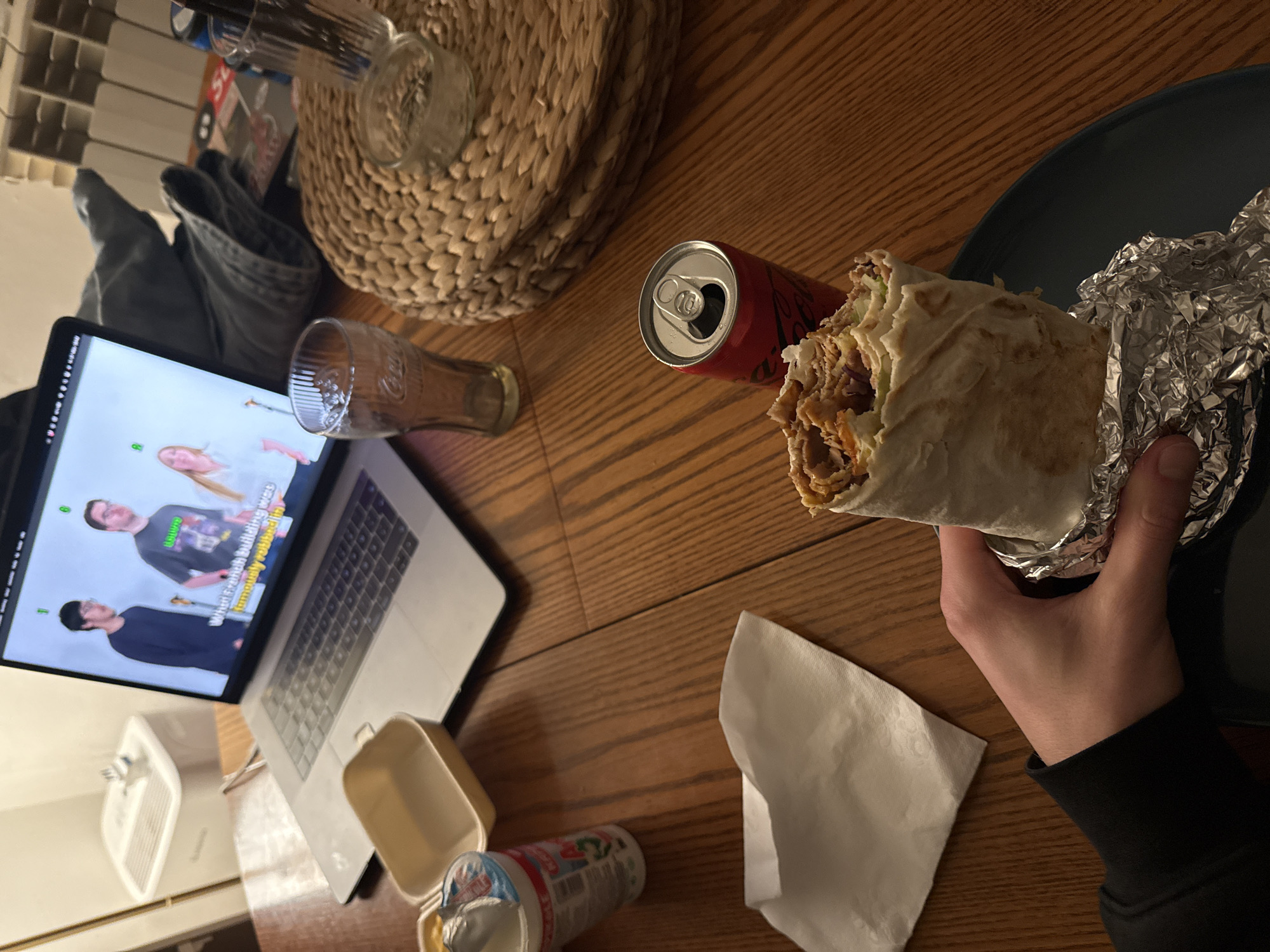 The image presents a high-angle view of an indoor setting in Milan, Italy, focused on a wooden table. A person's hand, wearing a black long-sleeved garment, holds a large kebab wrap, partially enveloped in crinkled aluminum foil, over a dark blue plate. The kebab's filling, including meat and shredded vegetables, is visible. To the left of the kebab, an open red Coca-Cola can stands upright. Adjacent to it, a crumpled white paper napkin lies on the table surface. In the upper left portion of the frame, a silver laptop computer, identified as a MacBook Pro, is open and displaying a video. The video screen shows three individuals – two males and one female – with English text overlaid, part of which reads "When French building was famously robbed". Next to the laptop, an empty beige rectangular container, possibly from a takeaway meal, is visible. Below this, a white plastic cup with a red and blue label, possibly a yogurt container, sits. On the upper right side of the table, an empty clear Coca-Cola branded glass stands. Behind it, a stack of several light-brown woven placemats is visible, with a small clear glass dish placed on the topmost mat. The background behind the table includes a white wall, a white panel radiator, and a white appliance, which appears to be an air purifier or humidifier.