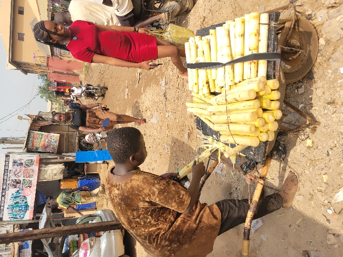 The scene depicts an active outdoor commercial area at Dollar Junction in Awka, Nigeria, under bright daylight. In the foreground, a barefoot dark-skinned male, wearing a brown textured top and dark trousers, is bent over a two-wheeled cart. He is actively peeling a sugarcane stalk using a knife, with numerous peeled sugarcane stalks piled on the cart, some secured by a black strap. The ground is unpaved, dusty, and strewn with sugarcane peelings and debris. In the midground right, a dark-skinned female in a short red dress walks towards the right, looking downwards, holding an object in her left hand, and carrying a yellow bag. To her left, another dark-skinned female in a black top and light brown skirt walks away from the camera, carrying a blue object. The background features various commercial structures and a multi-story building. A large banner on the left advertises "DEALS ON RICE, BEANS, YAM FLOUR, PLANTAIN FLOUR, GARRI, ETC." and specifies "VENUE: DOLLAR JUNCTION." A silver sedan with its trunk open is parked on the far left, near which a male in a green shirt is visible. At least two motorcycles are present in the background, one with a rider facing away from the camera. Overhead wires traverse the upper frame.