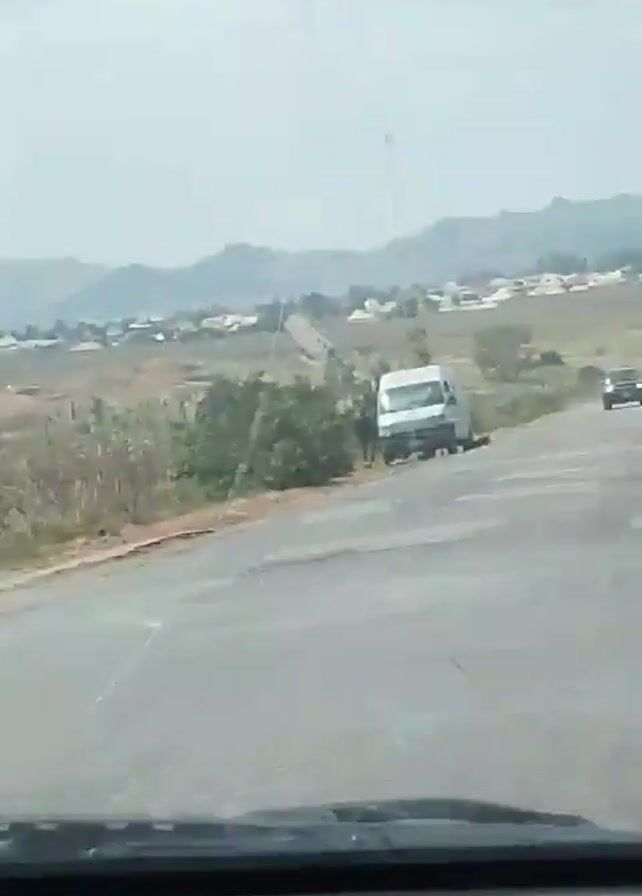 view from inside a car driving on a road with cracked pavement. There is a white van parked on the left side of the road and a dark SUV is approaching the car filming. In the background, there is a small town and a hilly landscape. A tree is visible on the right side of the road. The windshield of the car filming is cracked. There are some people standing near the parked van. The sky is overcast.