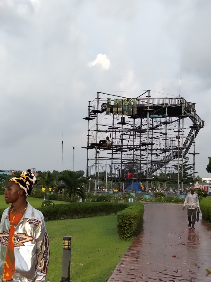 A park scene with a large, multi-level structure resembling an obstacle course dominates the background