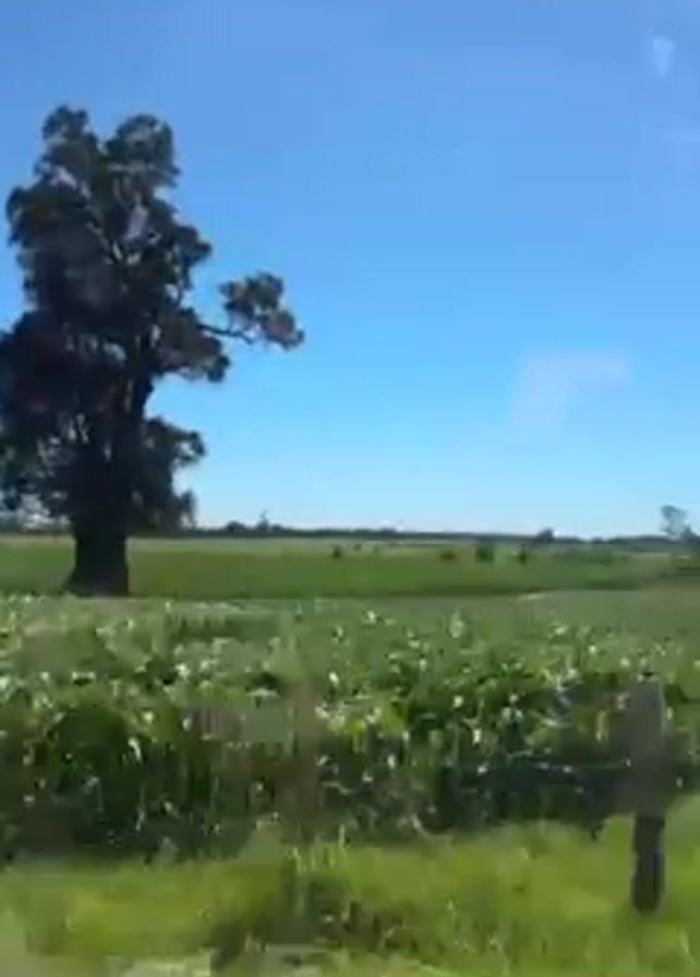 The video depicts a rural landscape under a clear blue sky. The camera appears to be moving, likely from a vehicle. The foreground features a field of lush green vegetation. A solitary tree stands prominently in the middle of the field. In the distance, there are power lines and other trees dotting the horizon.