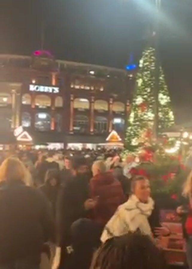 bustling Christmas market at night. A crowd of people of various ages and ethnicities mill about, many wearing winter clothing. A large, decorated Christmas tree stands prominently in the foreground, alongside smaller Christmas trees. The building "BOBBY'S" is visible in the background, illuminated with its signage. The entire scene is lit up by strings of lights and lampposts, creating a festive atmosphere. The camera moves slightly, blurring the background at times.
