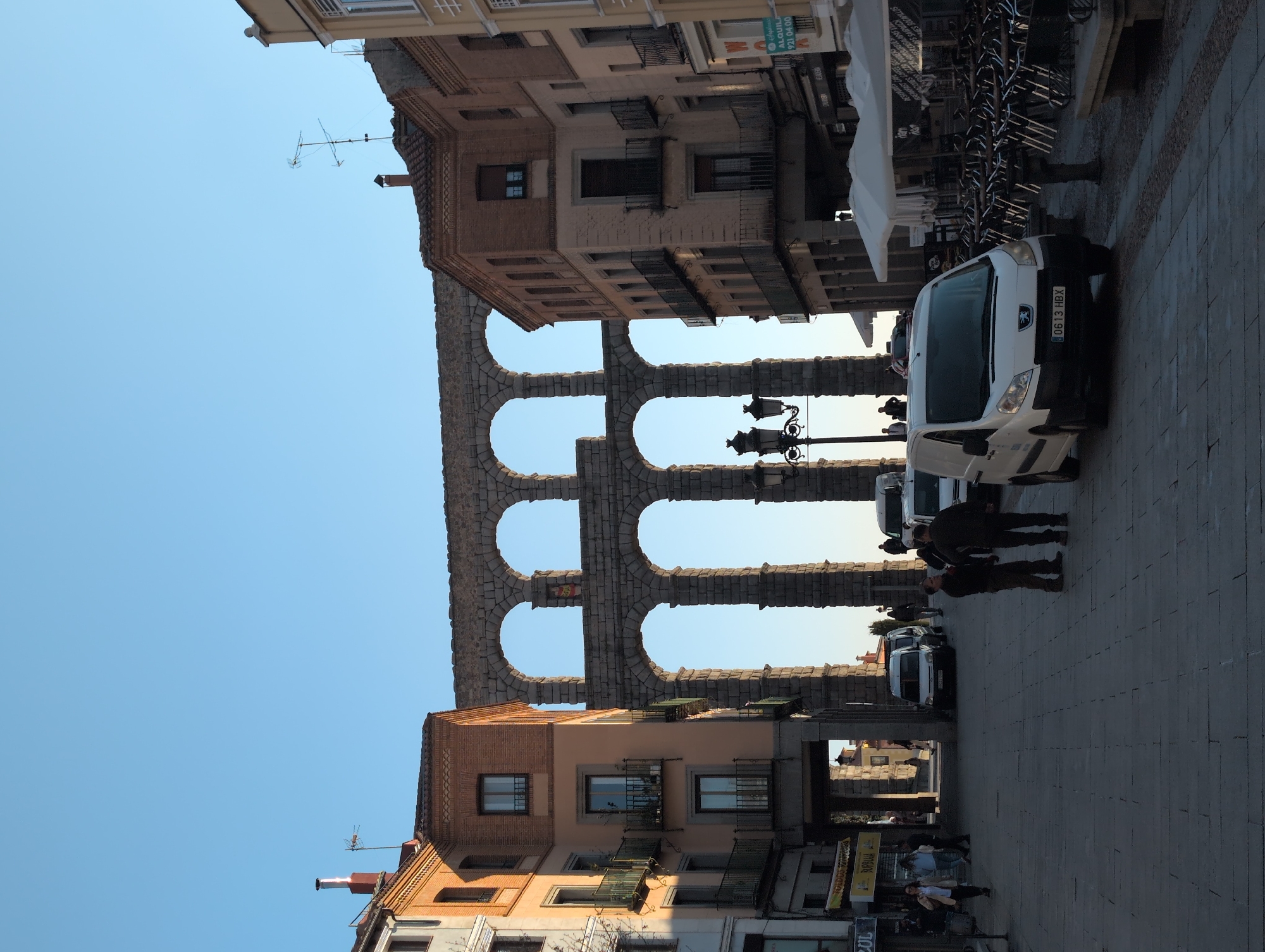 The scene depicts a late afternoon or early evening view of the Plaza del Azoguejo in Segovia, Spain, centered on the ancient Roman Aqueduct of Segovia. The aqueduct, constructed of large granite blocks with multiple arches, dominates the background, rising high above the street level and extending between two multi-story buildings. On the left, a light-colored building with multiple windows and dark metal balconies abuts the aqueduct, featuring segments of brickwork on its upper floors and a visible chimney and antenna on its roofline. Below, the street widens into a paved pedestrian area with several individuals walking or standing. Further down the street, beneath an arch of the aqueduct, vehicles are parked and more people are visible. On the right, another multi-story building, lighter in color with dark windows and balconies, also flanks the aqueduct. Its ground floor hosts commercial establishments with outdoor seating areas under large white umbrellas. These areas feature numerous stacked chairs and tables, suggesting a cafe or restaurant preparing to open or close. A dark, ornate streetlamp stands prominently in the mid-ground. Several people are present in the foreground and mid-ground. Two men are standing near the center, one wearing a dark jacket and the other a darker outfit, facing towards the right side of the image. A white Peugeot van with license plate "0613 HBX" is parked or moving slowly towards the viewer on the right side of the paved street. Another similar white van is parked further down the street on the left, near the base of the aqueduct. The sky above is clear and light blue, showing no clouds. Shadows are long, indicating a low sun angle from the right side of the frame.