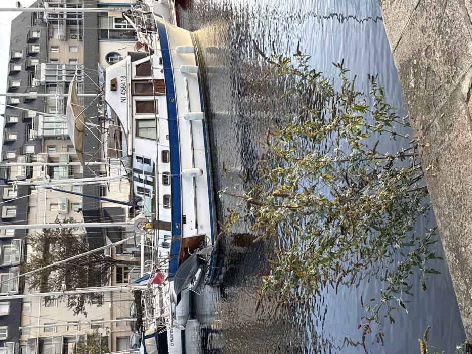 A white and blue boat with the number NI 458418 is docked in the water near a stone quay. A small tree with thin branches partially obscures the boat. Tall buildings with multiple windows are visible in the background behind a series of boat masts. The water reflects the sky and the surrounding objects, creating a shimmering effect.