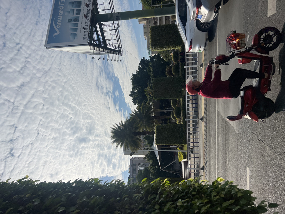 A person in a pink helmet and maroon jacket rides a red electric scooter on a paved road. A white car is parked behind them, near a metal fence. On the opposite side of the road, there's a line of square-shaped bushes and trees. A palm tree and buildings are visible further back. Above, a billboard stands tall against a cloudy sky. Lush green vegetation is visible in the foreground.