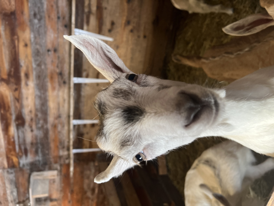 - "A close-up, head-on photograph taken in the city of Середа, Russia, displays a domestic goat with predominantly white fur and mottled grey-black markings on its head and erect ears" by FM-Ke9ym1, licensed under CC BY 4.0